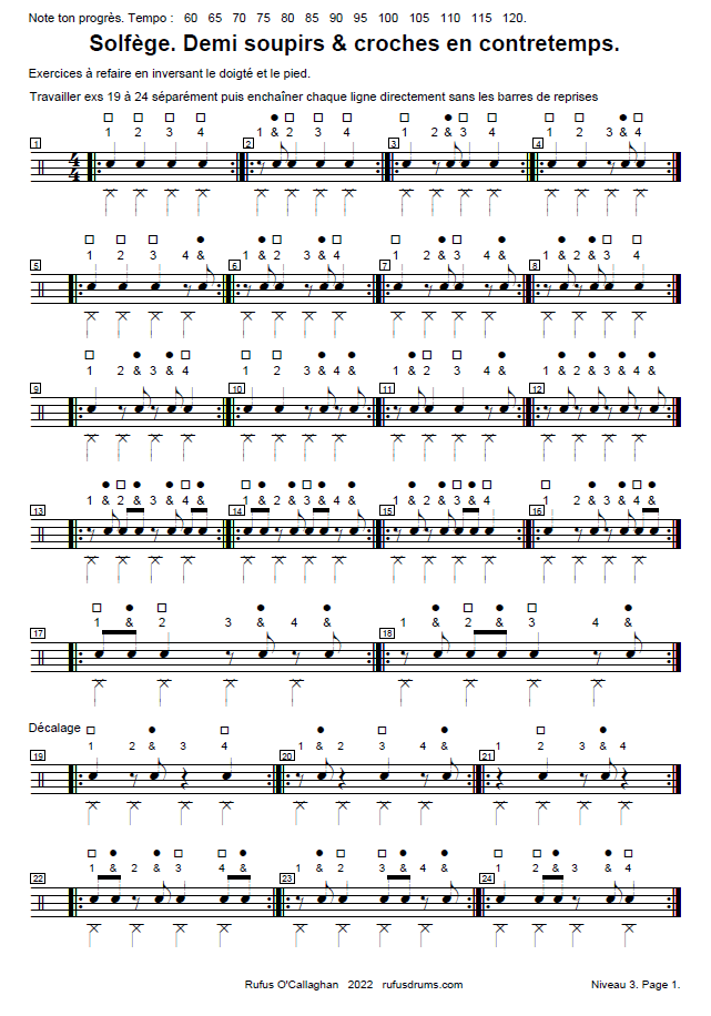 • Accents en doubles croches, roulements, ras et drags (ruffs)