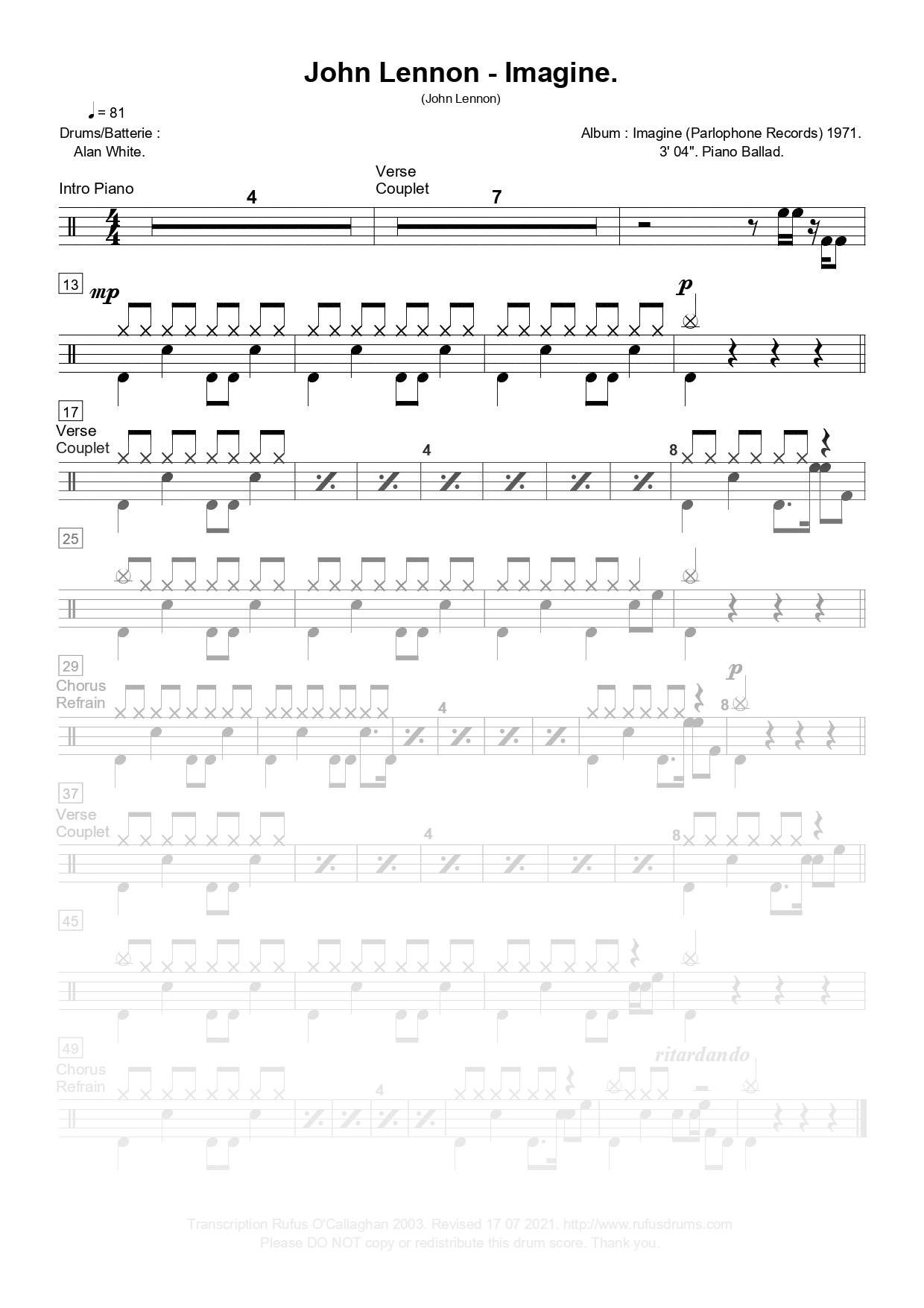 Dans Imagine, la batterie privilégie la finesse et la régularité. La grosse caisse marque doucement les temps principaux, tandis que la caisse claire et le hi-hat créent un rythme constant et aérien. Cette approche minimaliste contribue à l’atmosphère calme et introspective de la chanson.