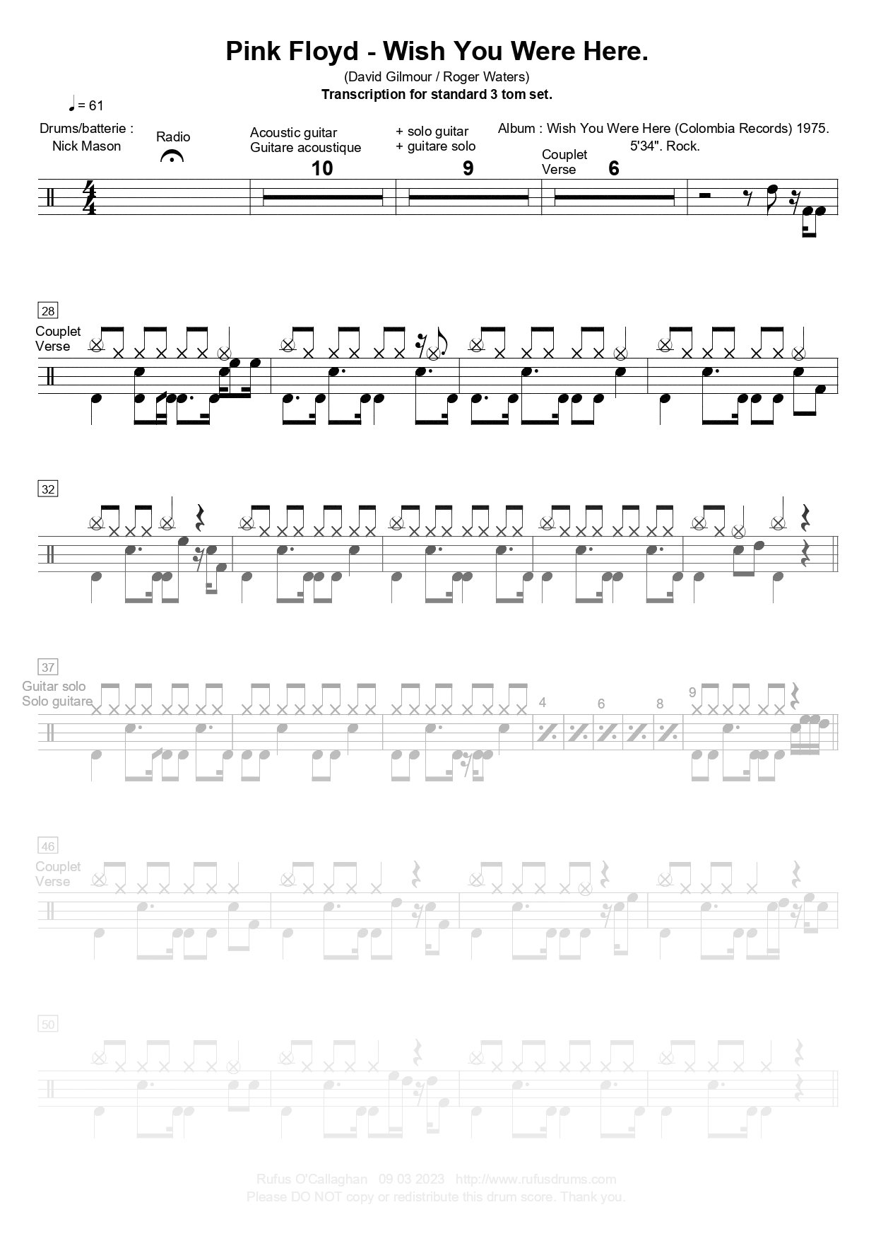 Partition de batterie – Pink Floyd – Wish You Were Here.