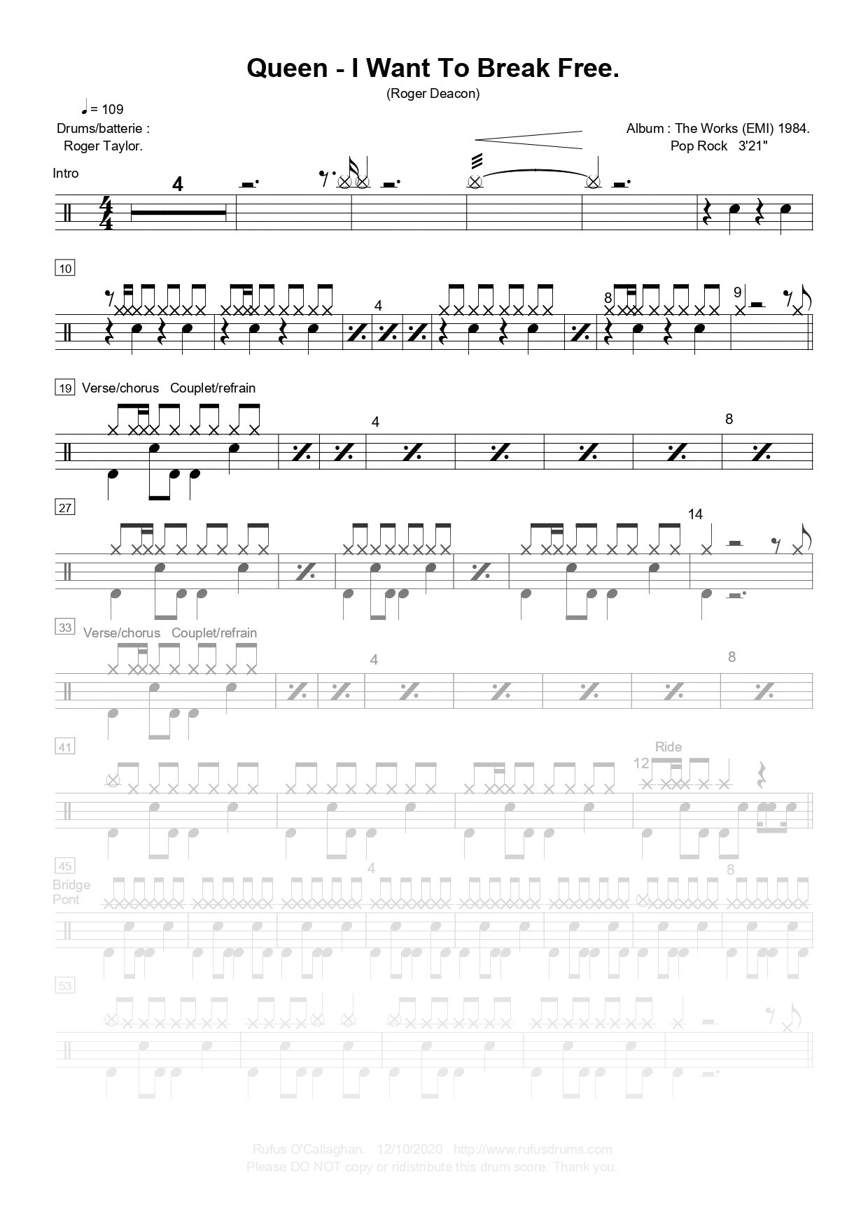 Dans I Want to Break Free, la batterie repose sur un rythme stable et entraînant. La grosse caisse et la caisse claire créent une base solide, tandis que le hi-hat et les cymbales assurent une pulsation constante qui soutient les autres instruments. Le groove permet de maintenir l’énergie et l’enthousiasme caractéristiques de ce morceau.
